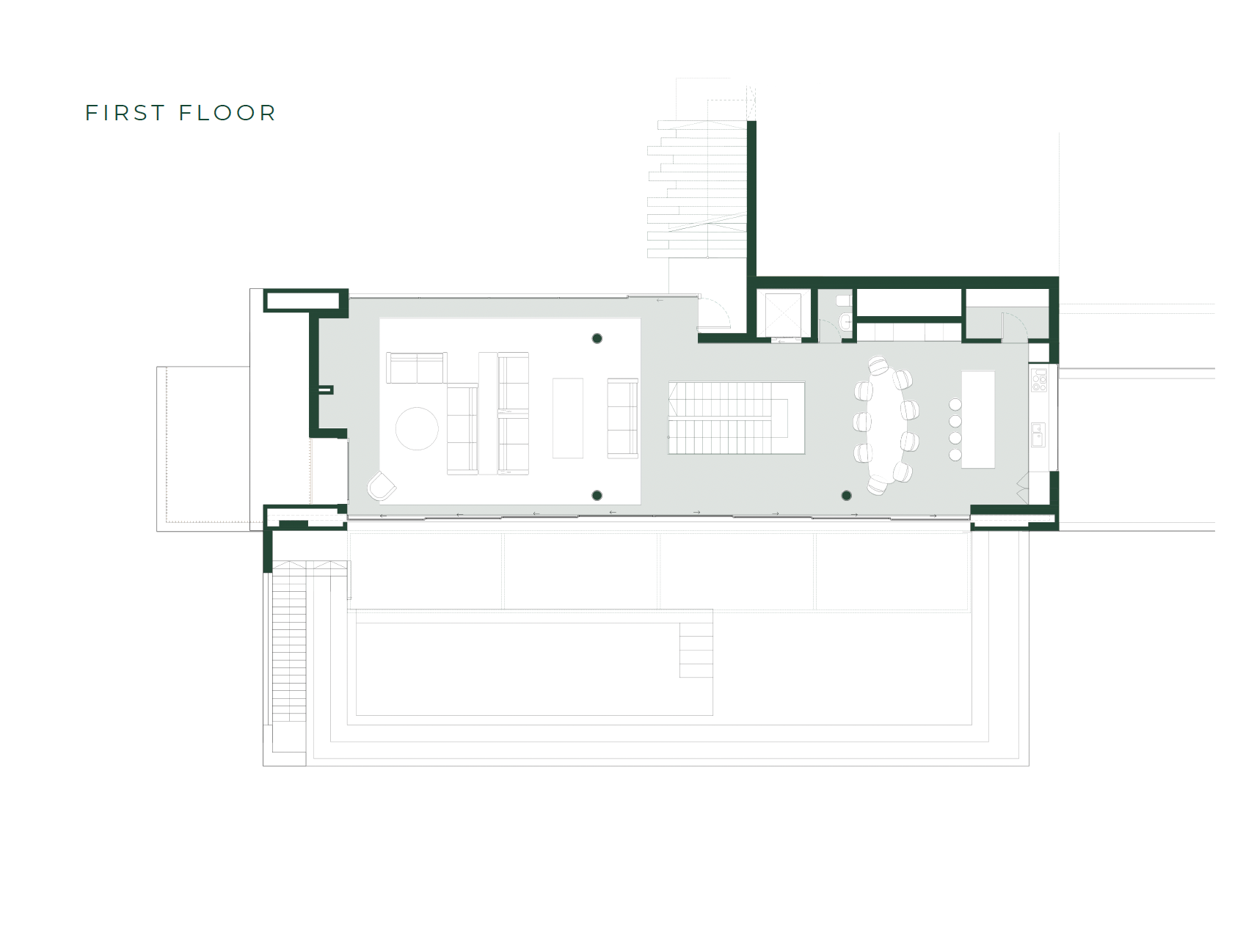 The villa is arranged over several floors to create a clear distinction between social and private zones while maintaining visual continuity throughout. Floor-to-ceiling glass walls frame open views towards the Mediterranean and the Serranía, allowing natural light to define the interior atmosphere. On the main level, an expansive open-plan configuration brings together a bespoke high-end kitchen with minimalist island, a formal dining space and a spacious living room that acts as the architectural focal point of the home. From this level, direct access leads onto the principal terrace where the linear infinity pool is fully integrated into the design. Optional additions such as an outdoor kitchen and al fresco dining area enhance the functionality of the exterior, making it equally suited to daily use and larger gatherings.