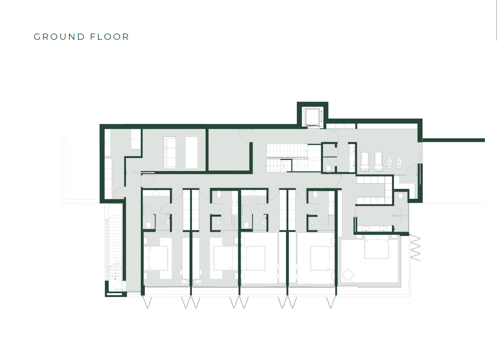 The level below accommodates the primary sleeping quarters, where five well-proportioned bedroom suites each benefit from their own en-suite bathroom, ensuring privacy for residents and guests. A family lounge provides a more relaxed secondary living space, while a dedicated fitness suite with its own bathroom supports wellness routines within the comfort of home. A separate media lounge offers flexibility for cinema use or as an additional private sitting area.